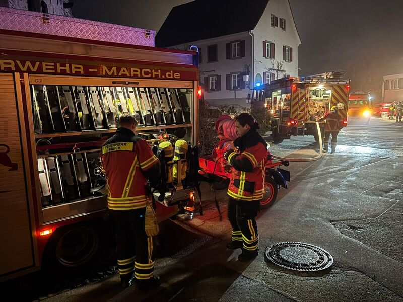Beim Eintreffen der örtlichen Kräfte stand das Wohnhaus bereits im Vollbrand, weswegen weitere Kräfte zur Einsatzstelle nachgefordert wurden. Gegen 5 Uhr wurde die Entscheidung getroffen, den für den Unterstützungsbereich (UB) Markgräflerland zuständigen überörtlichen Brandbekämpfungszug nachzufordern: Der Brandbekämpfungszug des UB Kaiserstuhl. Dieser besteht aus jeweils einem Löschfahrzeug aus Breisach, March sowie Vogtsburg, außerdem aus einem Führungsfahrzeug, welches ebenfalls von der Feuerwehr March entsendet wird; insgesamt 29 Einsatzkräfte. Zeitgleich mit Eintreffen des Brandbekämpfungszugs Kaiserstuhl, traf auch eine zweite Drehleiter ein, die von Bad Krozingen entsendet wurde und die Feuerwehr Buggingen wurde mit dem Sicherstellen des Grundschutzes für die Sulzbachtal-Kommunen beauftragt. Spätestens um kurz nach sechs, als die Führungsgruppe Markgräflerland nachalarmiert wurde, befand sich der Einsatz in der Gefahrenabwehrstufe "Brand-4".