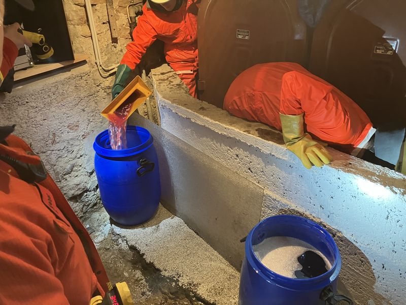 Im Keller eines Einfamilienwohngebäude wurde der Heizöltank von einem Treibstofflieferanten betankt. Dabei sind aus bisher ungeklärter Ursache 160 Liter Heizöl über eine Öffnung ausgelaufen. Der Tank, der aus zwei miteinander verbundenen Behältern besteht, ist innerhalb eines gemauerten Auffangbeckens platziert. Dort sammelte sich die ausgelaufene Flüssigkeit 5 cm hoch. Der Treibstofflieferant hat daraufhin eine Spezialfirma mit der Aufnahme des ausgelaufenen Treibstoffs beauftragt. Der Hauseigentümer erfuhr im Laufe des Tages, dass die Spezialfirma nicht mehr am selben Tag zur Bergung des Heizöls wird anrücken können, sondern am Morgen des Folgetags. Der Hauseigentümer machte dieser Umstand zunehmend Sorgen, weswegen er am frühen Abend schließlich den Feuerwehrkommandanten telefonisch verständigte. Daraufhin führte die Feuerwehr im betroffenen Keller eine Nachschau durch und stellte fest, dass sich die ausgelaufene Flüssigkeit bereits durch das Mauerwerk des Rückhaltebeckens gearbeitet hatte und das Erdreich bedrohte. Nach einigen Abstimmungen wurde festgelegt, dass der ausgelaufene Kraftstoff umgehend aus dem Auffangbecken aufgenommen werden muss.
